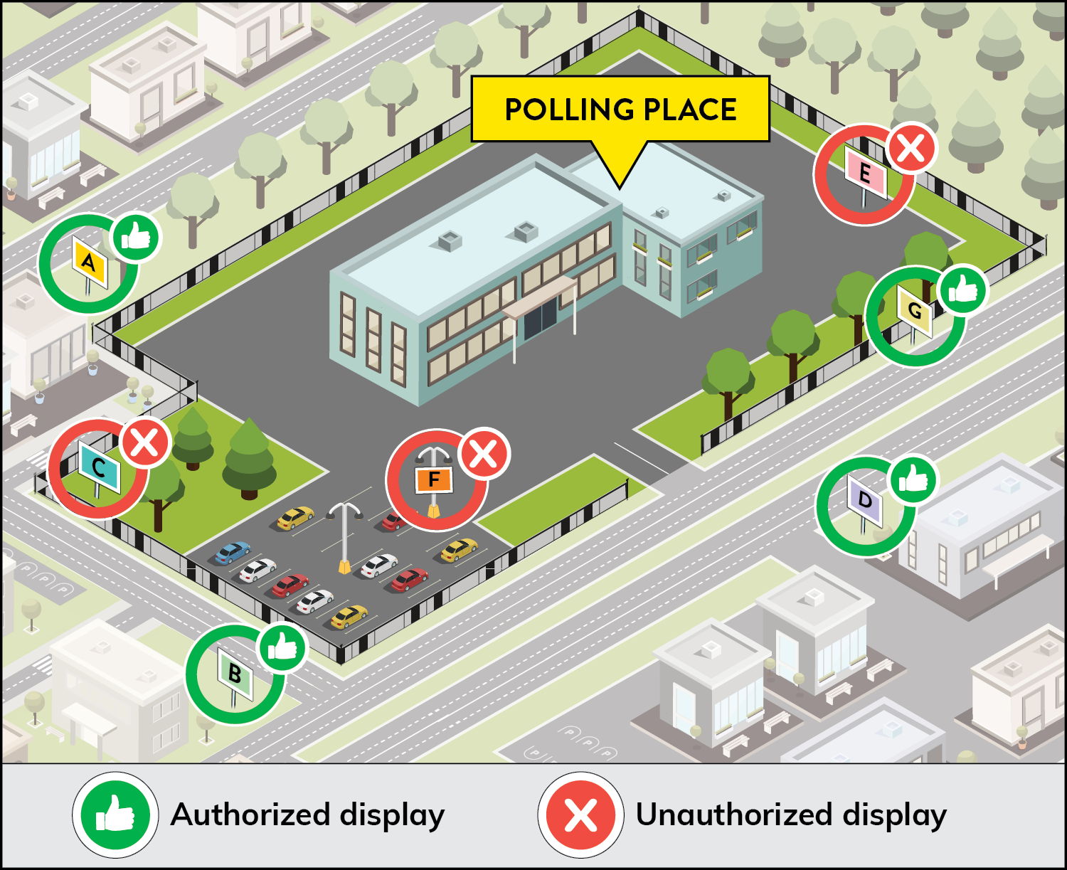 If voting is taking place in a school, the playground is part of the polling place, so no signs may be placed there. Signs can be posted on the streets and on property near the polling place.